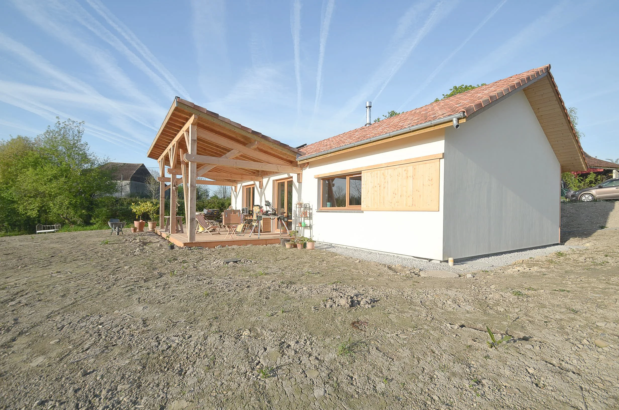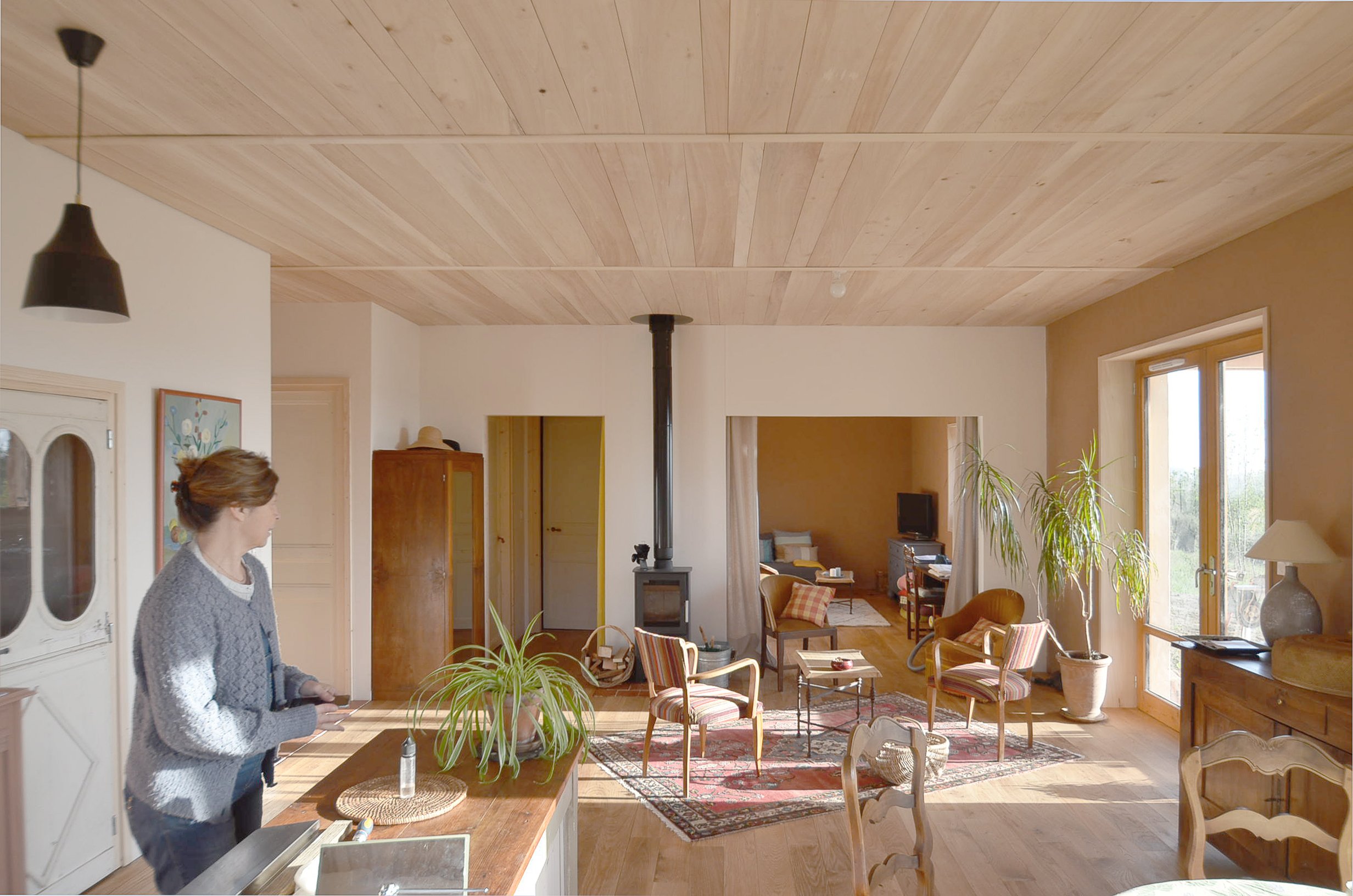 Cette commande d’une maison paille avec un budget limité a été l’occasion de faire la synthèse de notre expérience acquise en la matière. Nous avons travaillé en partenariat avec l’entreprise Eco-préfa d’Arudy, dont ce chantier inaugurait leur ligne de préfabrication lourde de murs ossature bois isolés paille. Un travail d’optimisation poussée du coût a pu être réalisé avec eux.