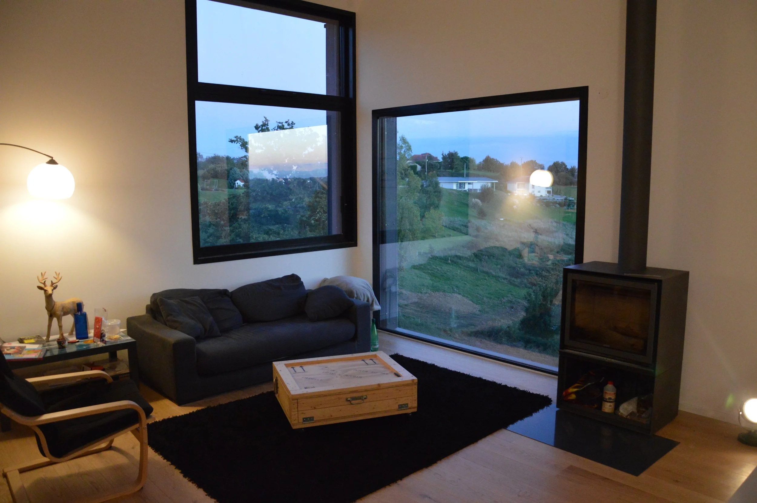 Afin de laisser libre la partie en plateforme du terrain, pour l’usage de jardin, nous avons implanté la maison sur une terrasse en contrebas. L’accès se fait par une passerelle, et le plan est «inversé»: les pièces de vies sont situées à l’étage, associées à une terrasse, les chambres sont en dessous.