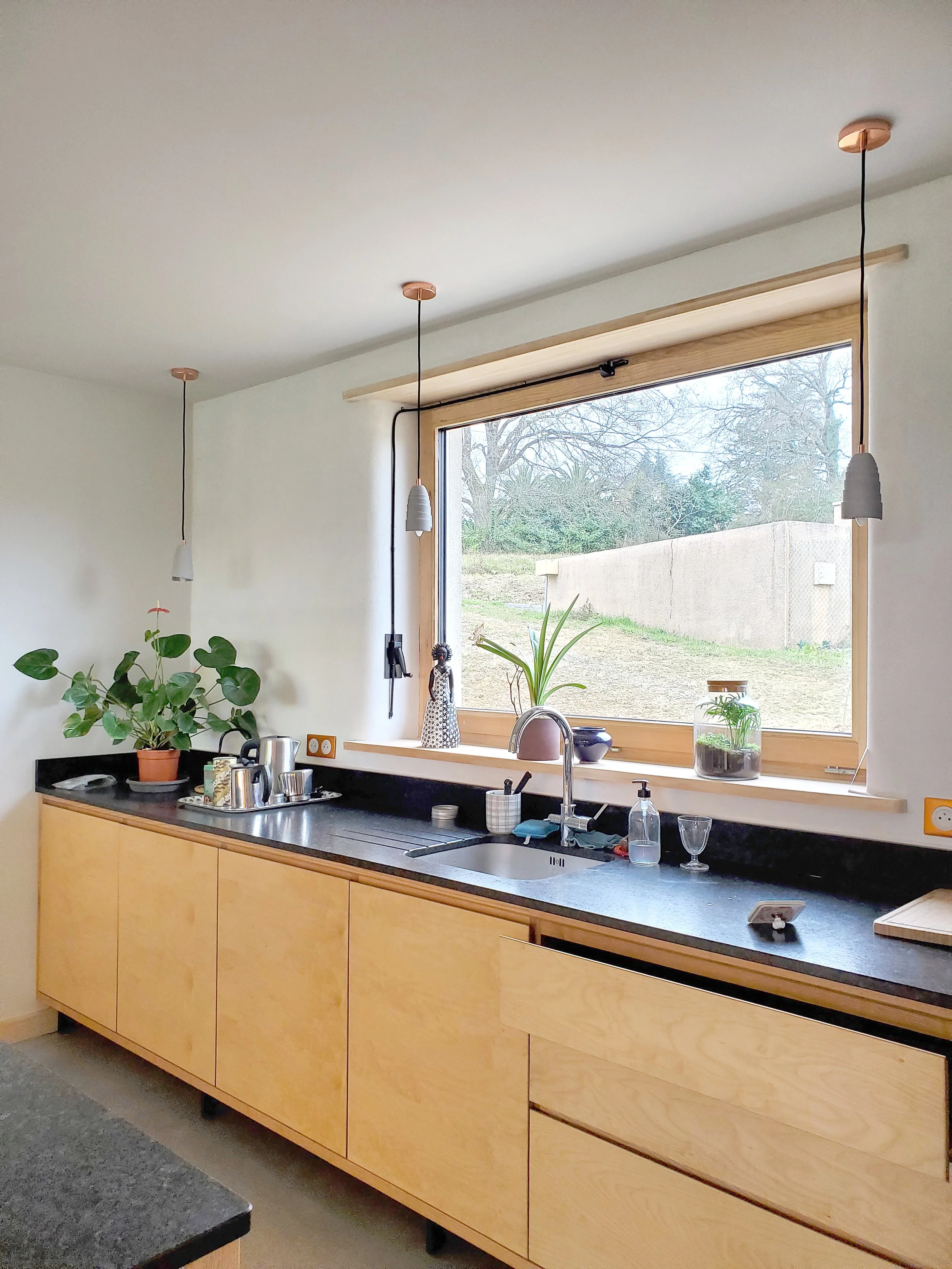 la conception a porté sur la qualité des espaces intérieurs, des matériaux et des détails d’agencement: sols en béton quartzé, cloison en brique de terre crue, cuisine, placards et plafonds en contreplaqué de bouleau.