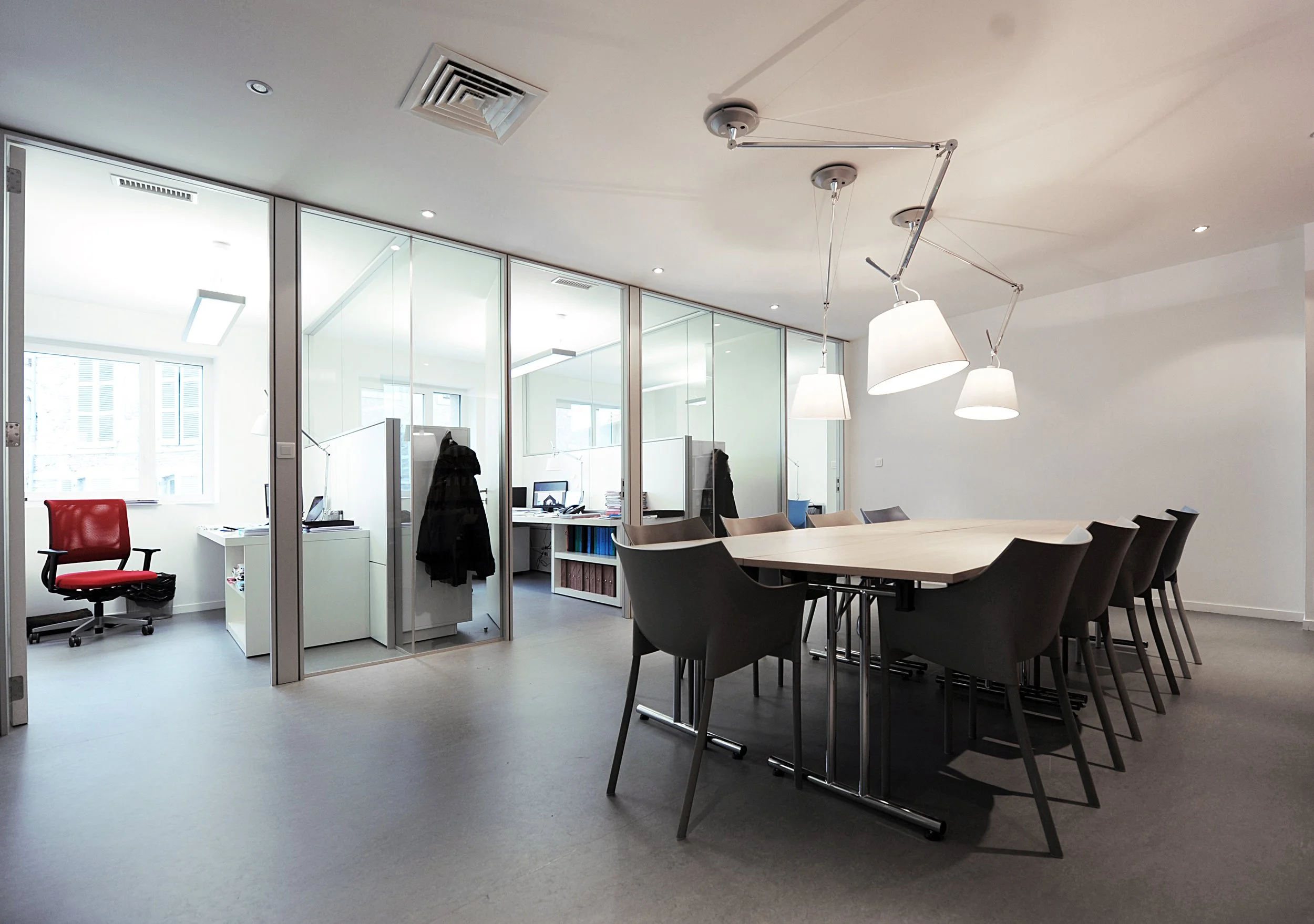 Pour cet aménagement en existant, nous avons mis en oeuvre tous les dispositifs possibles afin d’apporter la lumière naturelle dont manquaient les locaux. Un faisceau de solutions a permis d’améliorer la situation: Création d’une galerie largement vitrée en retrait de la façade maçonnée, positionnement de la trémie d’escalier permettant une pénétration de la lumière jusqu’au fond du local. Nous avons dessiné l’ensemble du mobilier sur mesure, avec un large recours au blanc et à la transparence.